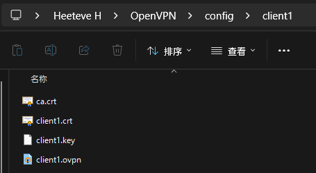 2.3.2 导入配置文件和证书 打开配置文件目录,默认为%USERPROFILE%\OpenVPN\config 在其中新建一个配置文件夹,将配置文件和证书复制到该目录下 包括client1.ovpn、ca.crt、client1.crt、client1.key